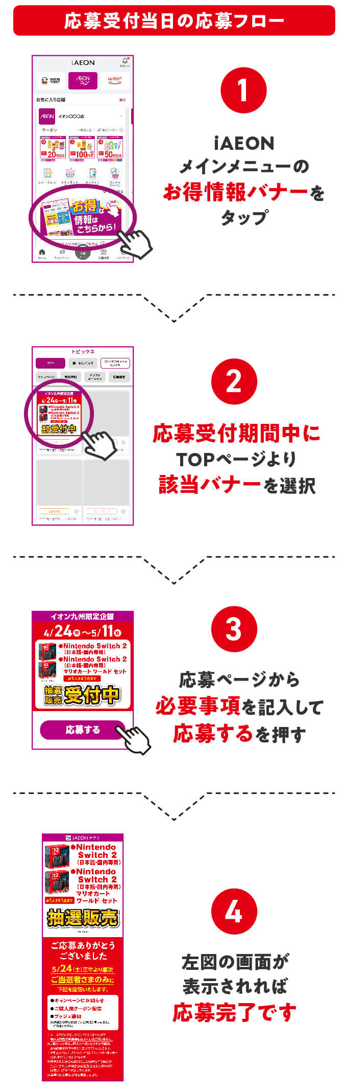 「Nintendo Switch 2」が当選した場合、購入時に当選確認などもありますので、応募前にイオン九州公式サイトに記載してある注意事項も必ず確認すること。