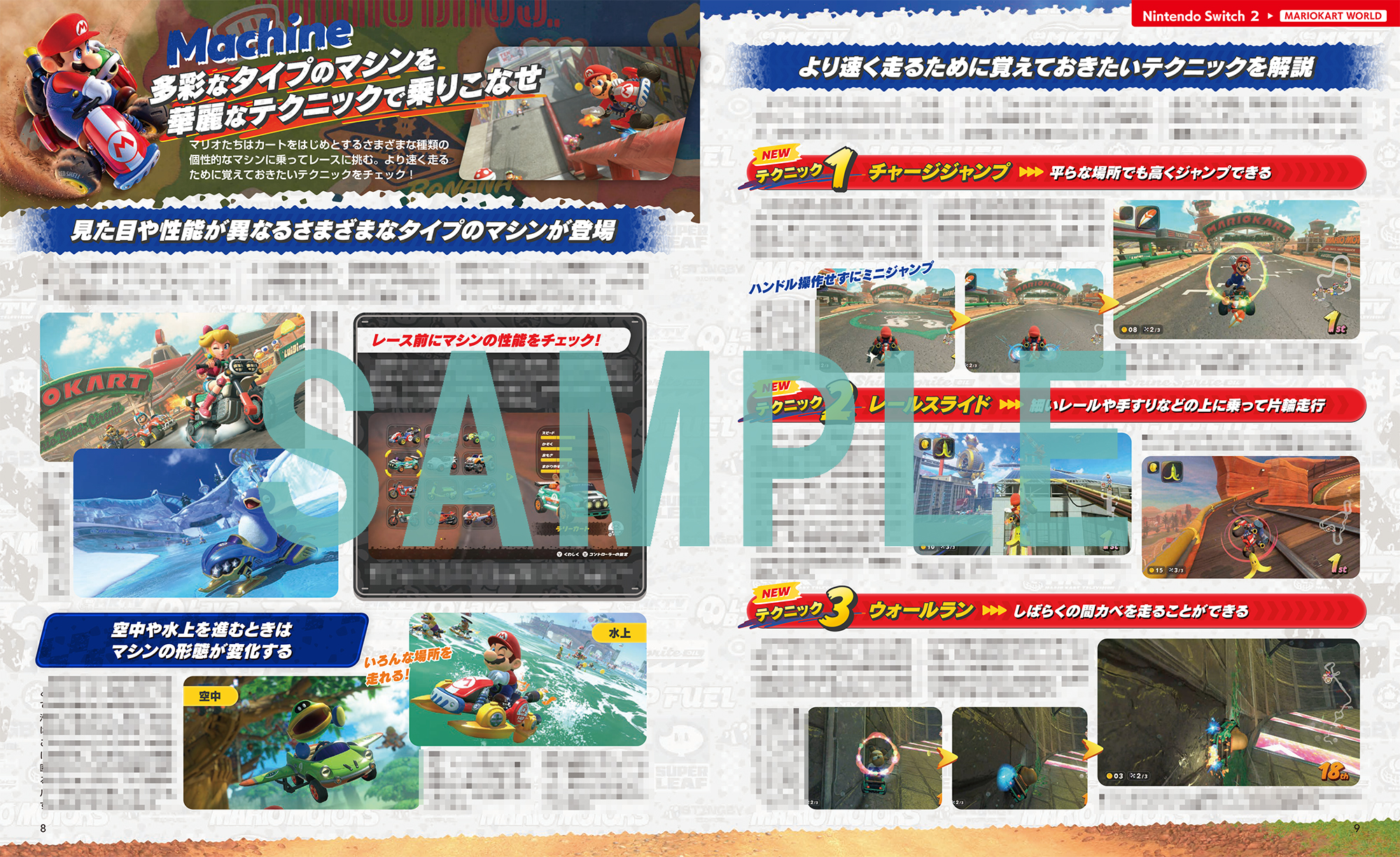 また「マシン」のコーナーでは、マリオたちが乗るマシンの概要と、新しいドライブテクニックのチャージジャンプ、レールスライド、ウォールラン、そしてシリーズおなじみのロケットスタートやジャンプアクションなど、より速く走るための8つのテクニックをお見せします。