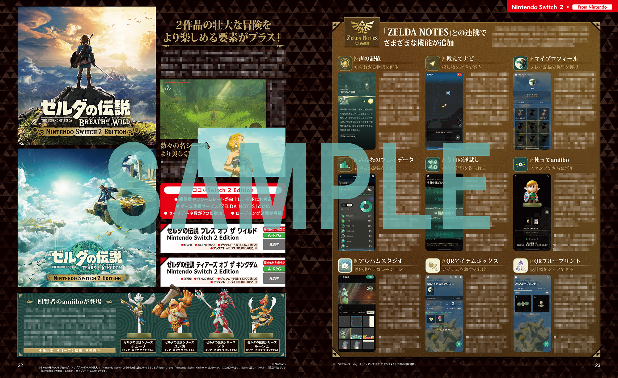 また『ゼルダの伝説 ブレス オブ ザ ワイルド Nintendo Switch 2 Edition』、『ゼルダの伝説 ティアーズ オブ ザ キングダム Nintendo Switch 2 Edition』(ともに任天堂)の記事では、ゲームの概要、四賢者のamiibo情報とともに、両作品をスマートフォン用無料アプリ「Nintendo Switch App」内コンテンツ「ZELDA NOTES」と連携させて楽しめることをくわしく紹介しています。