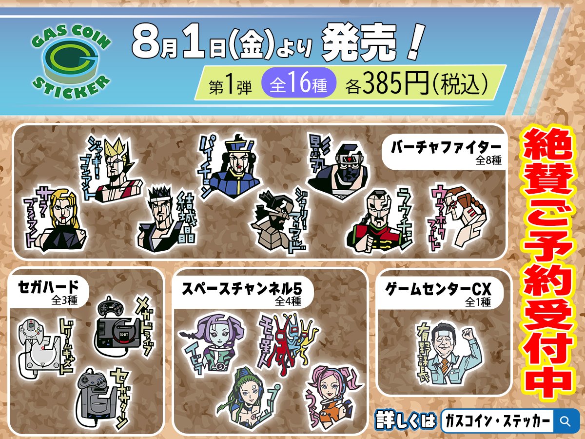 『ゲームセンターCX』の制作を行う株式会社ガスコイン・カンパニーが、ステッカーブランド『ガスコイン・ステッカー』より、第一弾として『SEGA』『ゲームセンターCX』のステッカーを全国の小売店・オンラインショップにて2025年8月1日(金)から発売することを発表しました。