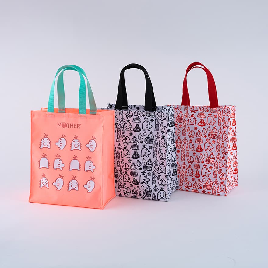 定番人気の軽くて丈夫な「スクエアートート」にMOTHERシリーズのちいさいバージョンがはじめてできました。デザインは3種類。どせいさんの総柄(ブラックとレッド)とキュートなパステルピンクがかわいい「どせいさんピンク」です。小物を入れておくのに便利な内ポケットと、口を結ぶひもがついています。