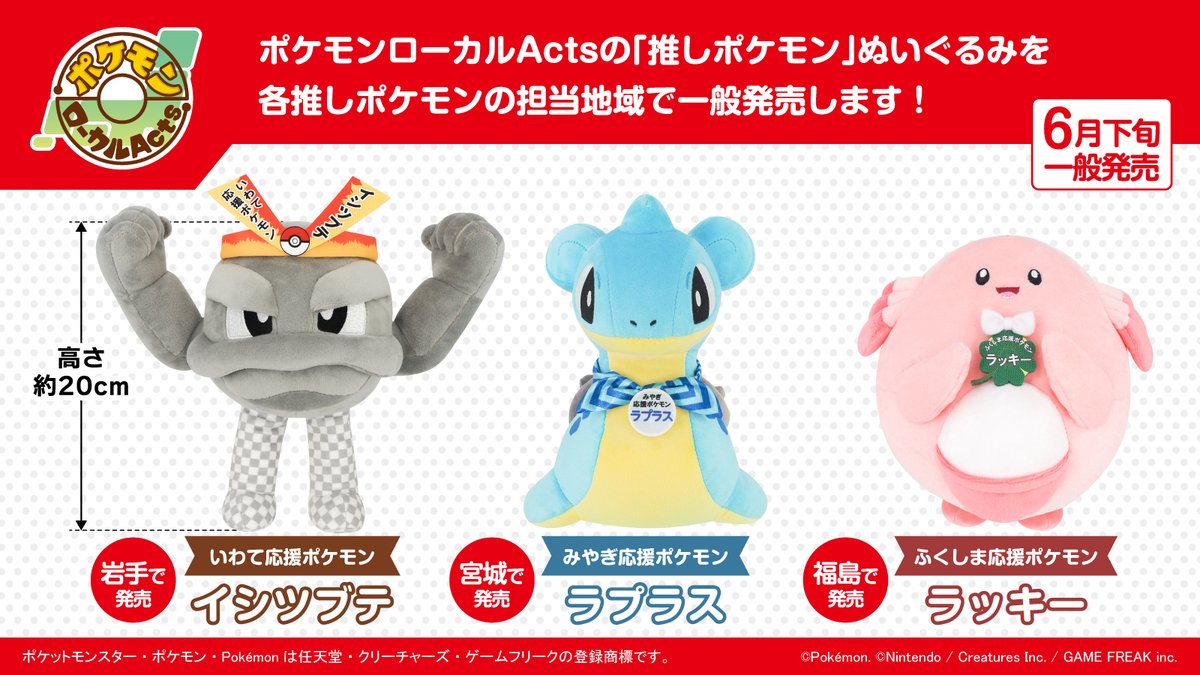 今回発売が決定したのは、 4月24日(木)~5月6日(火)の期間に宮城県で開催されたローカルActs物産展にて先行販売された、ポケモンローカルActs 推しポケモンぬいぐるみ イシツブテ・ラプラス・ラッキーの3種です。