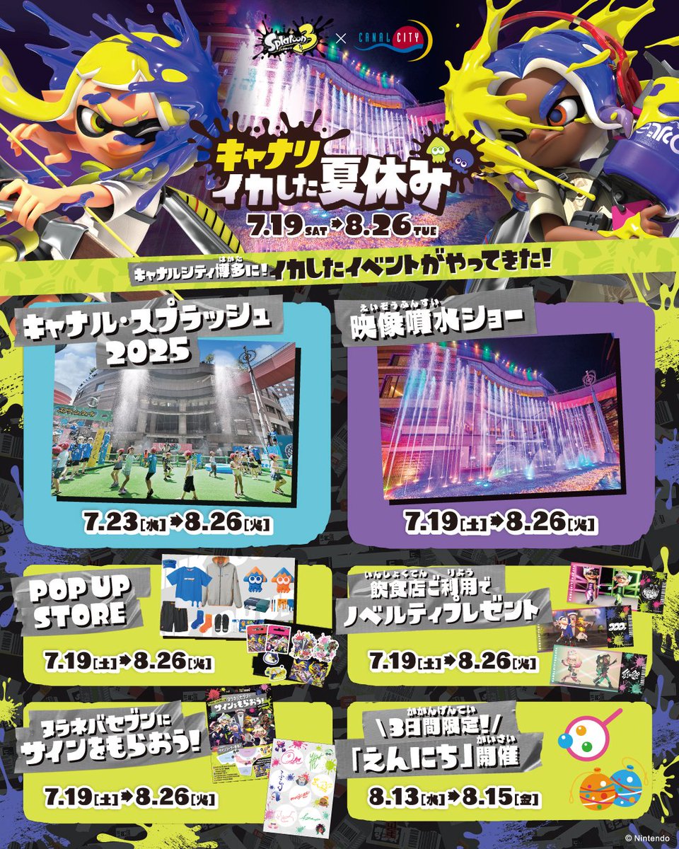 夏の目玉企画である体感型噴水アトラクション「キャナル・スプラッシュ2025」をはじめ、限定グッズも購入できるPOP UP STOREやスタンプラリー、スプラトゥーン3の映像や音楽とともに楽しめる噴水ショーの実施など、キャナルシティだけの「イカした」体験を盛りだくさんで楽しめるとのこと。