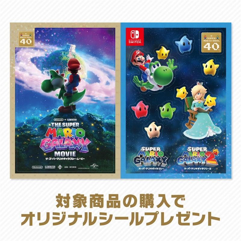 任天堂の公式オンラインストア「マイニンテンドーストア」とニンテンドーeショップでは、スーパーマリオブラザーズ40周年を記念し、対象商品の購入で映画『ザ・スーパーマリオギャラクシー・ムービー』と『スーパーマリオギャラクシー + スーパーマリオギャラクシー 2』のイラストを使用したオリジナルシールがもらえるキャンペーンが開催中です。